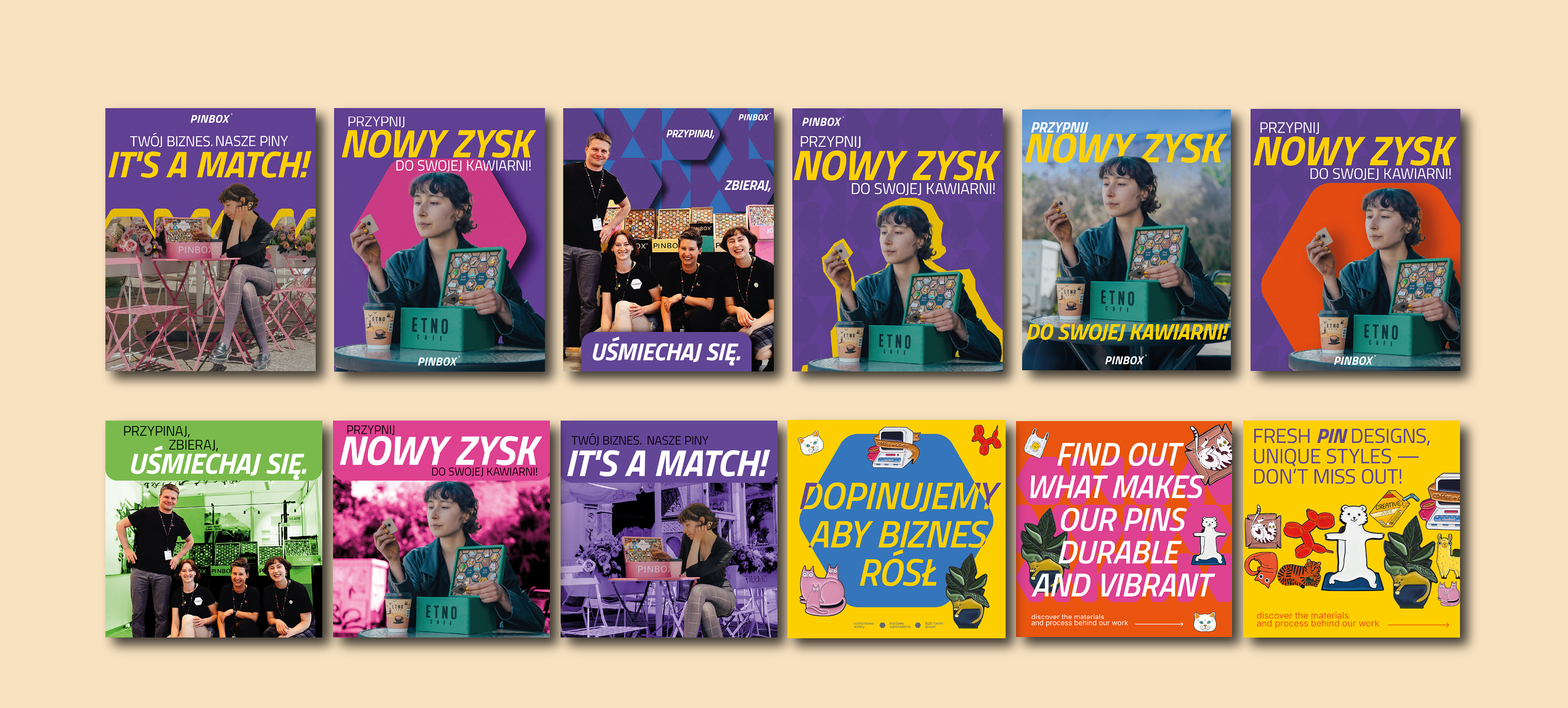 A series of playful and colorful social media visuals created for a brand specializing in enamel pins. The goal was to highlight the brand’s fun personality and showcase its products through engaging compositions and eye-catching layouts designed for Instagram and other digital platforms.